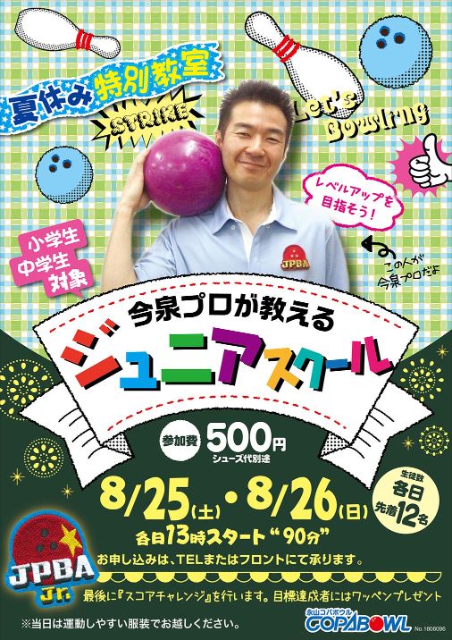 夏休みボウリングジュニアスクール開催決定! レッスン2018-07-04 23:00 今泉プロによるボウリングジュニアスクールを開催いたします。日程は8月25日(土)26日(日)2日間です。是非ご参加下さい。