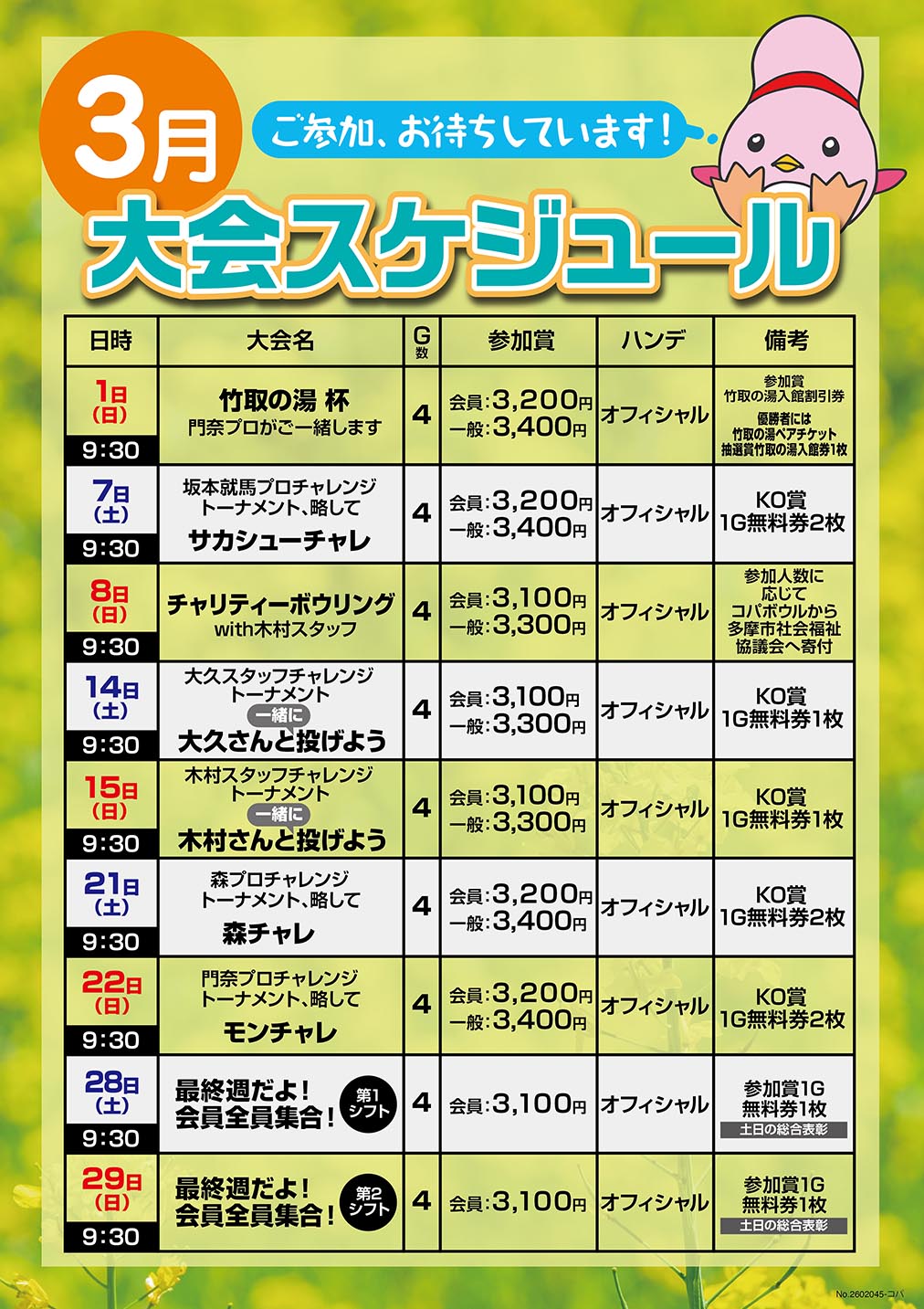 3月-永山コパボウル大会スケジュール 3/21(土)森ひかりプロ参加決定!